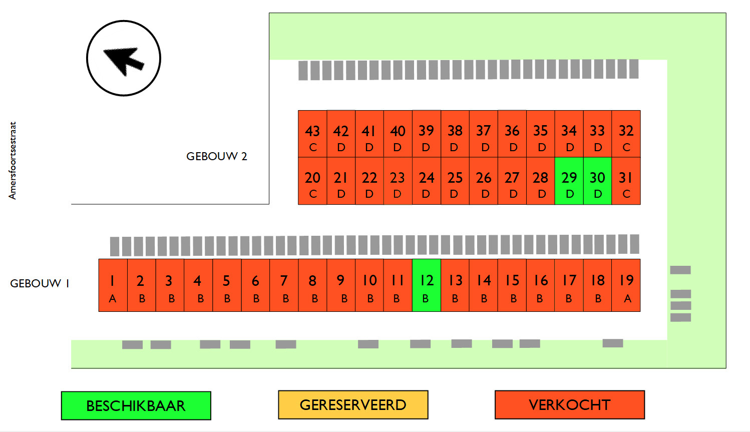 | Huisnummer | Type | Bruto vloeropp. (m²) Begane grond | Bruto vloeropp. (m²) 1e verdieping | Bruto vloeropp. (m²) Totaal | Aantal parkeerplaatsen | Koopprijs, ex BTW, von |